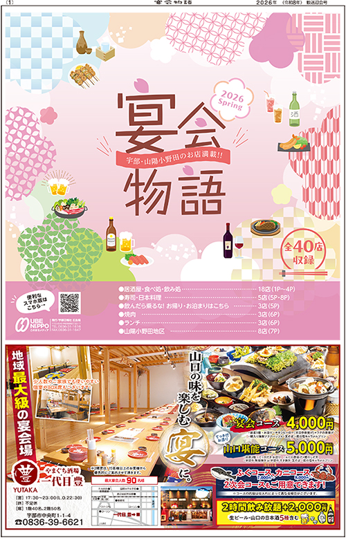 今年も歓送迎会の季節になりました! 宴会物語2026春号には宇部市、山陽小野田市のお店が満載! 会場探しにぜひお役立てください。 宴会物語2026春 電子ブック版 画像をタップまたはクリックすると電子ブックが開きます。 ↓ ↓ ↓