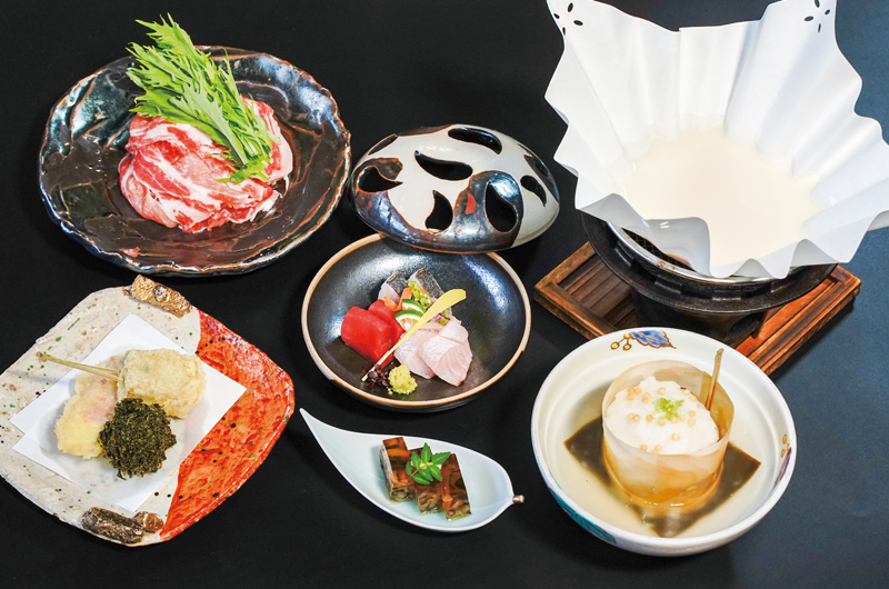 同会席は一例として、松花堂仕立て、秋刀魚揚げ浸し、ふぐ皮煮こごりなど前菜6種、お造りとして下関産虎河豚たたき香味野菜とともに、牡蠣のかぶら蒸し銀餡かけ、下関産とらふぐ唐揚げ、おあげの海鮮グラタン、真鱈白子の茶碗蒸しべっこう餡かけ、和牛もものしゃぶしゃぶ、じゃこご飯など全9品が並んで5,500円(6,050円(税込))。