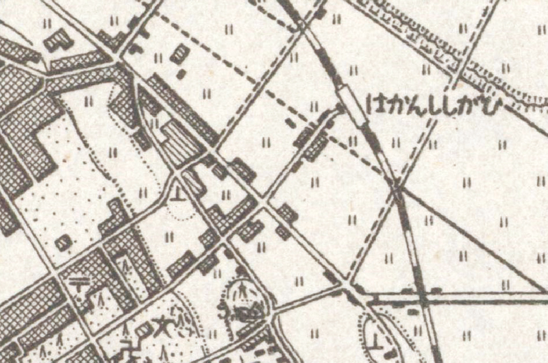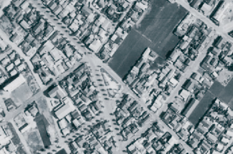 昭和初期の地図を参照すると、まだ三角広場の元となる道がなく直線路だけです。この道は昔の常盤通りから緑橋通りを経て常盤池に向かう経路の一部です。昭和30年代の都市計画図には東新川駅付近から三角形の底辺部分を通る道の記載がみられるので、この頃に広場として残されたのではないかと思いました。