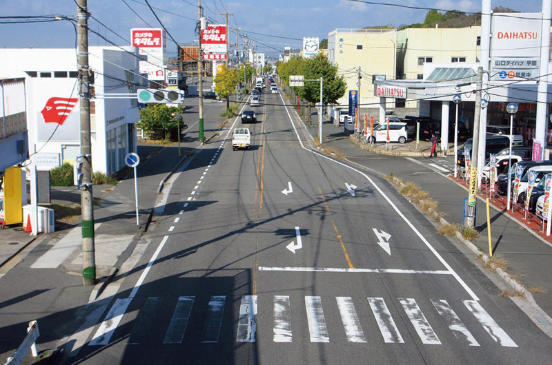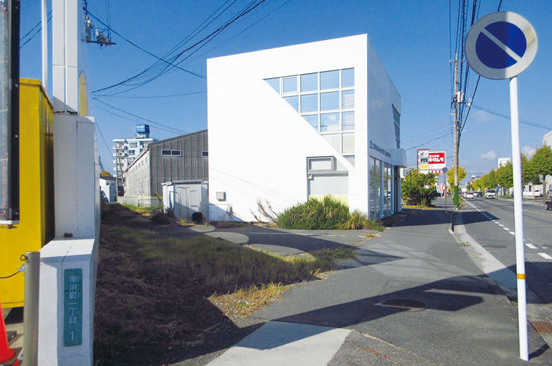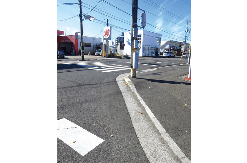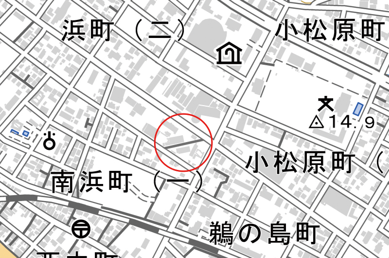 市街部の道路は、土地利用と往来の利便性を考えて概ね碁盤目状に整備されます。それだけにイレギュラーな斜めの道は目立ちます。そのような路地が産業道路と浜通りの交差点の西側にあります。通行禁止にはなっていませんが、産業道路側の歩道で分断されるため車通りがなく人も殆ど往来していません。地理院地図にも記載があるこの奇妙な路地の存在は、自転車で市内を巡る活動を始めた早い時期に気づいていました。