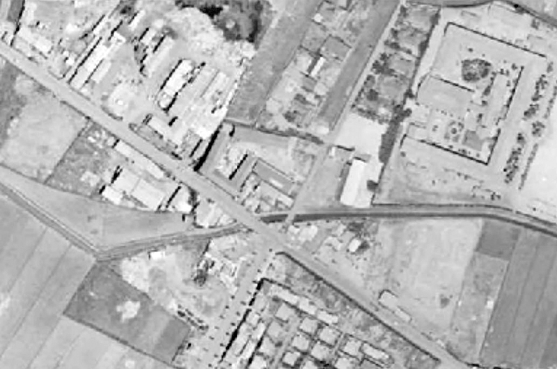 この斜めの路地は、昔あった水路を埋め立てた痕跡です。昭和30年代後半の航空映像には浜通り交差点を斜めに横切る水路が写っています。同時期の都市計画図に原田橋という記載もみられました。この水路を「あか川(漢字表記不明)」と呼んでいたと地元在住者から聞いたことがあります。しかし河川名を裏付ける資料や川だった時代の写真はまだ見つけられていません。