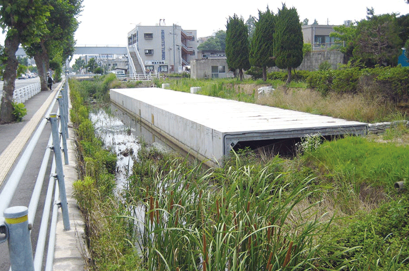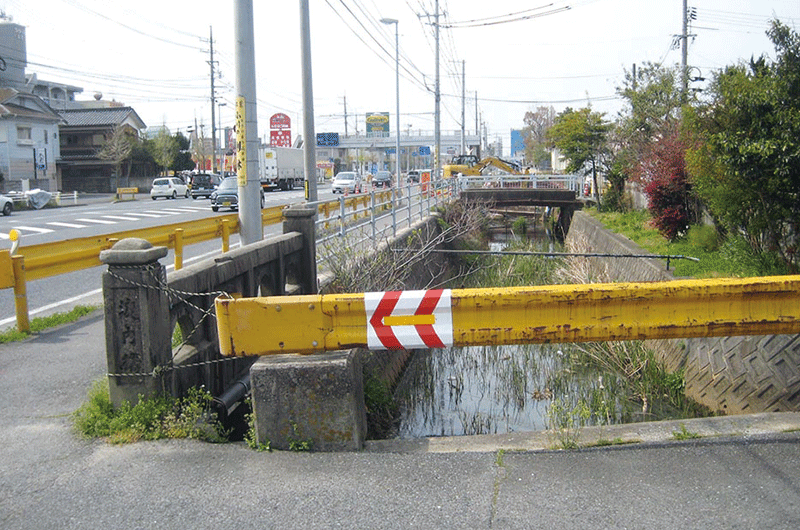 私が西梶返に住み始める前から渡内川を暗渠化する工事が進められていて、平成後期に神原交差点から北へ伸びてきました。この頃には変化する市街部の景観を記録する重要性に気づき、琴芝小学校の横にあった古めかしい橋も写真を撮っています。やがて暗渠化工事が渡内橋まで迫ってきたとき、見慣れたコンクリートの欄干がいつ消えてしまうのだろうかと気になったものです。渡内橋は2016年1月に取り壊され、現在では渡内川が屈曲するこの場所から歩道の下を流れています。